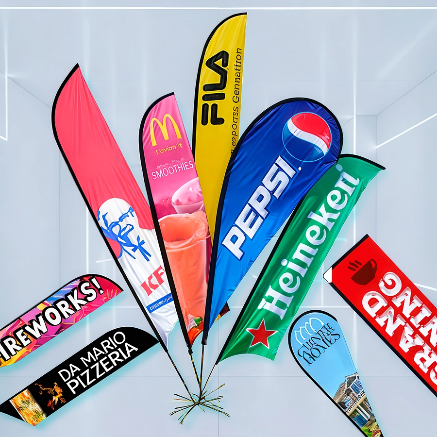 Banderas, gotas y velas publicitarias full color, resistentes y de alta visibilidad, ideales para eventos, activaciones y puntos de venta al aire libre.