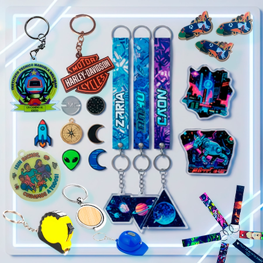 Llaveros y pines personalizados ideales para activaciones y regalos corporativos, con diseño full color, materiales durables y alta recordación de marca.